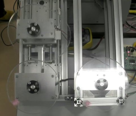 最初は「マスタ円盤」と「スレーブ円盤」のピンクのマークが一致していますが、 しだいにずれていってしまいます。加減速に追従できなくて位相スリップして しまったと考えられます。位相スリップしてしまっては、もう位相情報が失われて しまうわけですから、元には戻せません(戻すためには別に積分が必要で、 それはもう「速度制御ではなく位置制御」と言えます)。