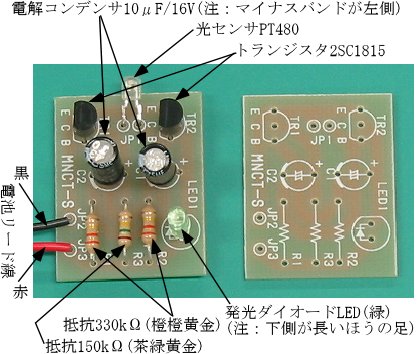 | 光トランジスタ | SHARP PT-480等 | 写真の方向のとおりです(回路図の1がコレクタ、 2がエミッタ)。 PT-480に限らず、ほぼどんな光トランジスタでもOKです。 パーツ屋さんと相談しましょう。 |