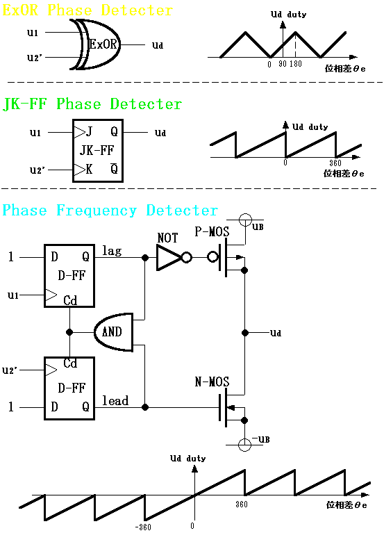 正方向と負方向の2種類の出力を持ち、-360°から+360°までの位相差を検出することができます。 この場合、u1の周波数の方がu2よりも高ければ正(+)ばかり、u1の周波数の方がu2よりも低いければ負(-) ばかりに出力されますので、周波数の符号も検出できるので、Frequency-Phase-Detecterと呼ばれます。 なお、後段のP-MOS,N-MOSトランジスタ回路部は「チャージポンプ」と呼ばれるものです。 |