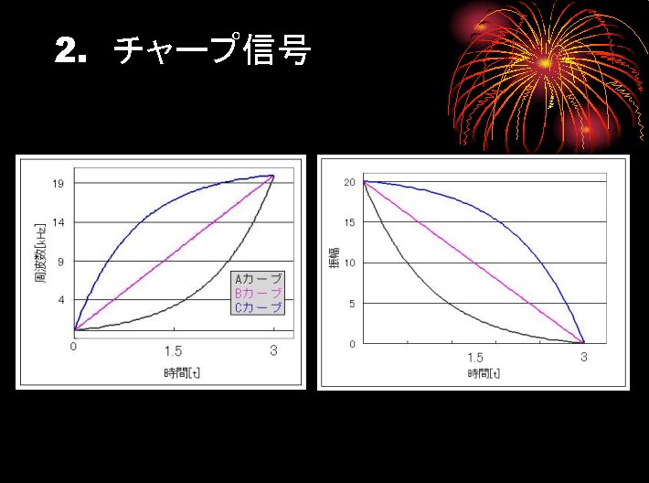 チャープ信号とは、時間とともに周波数/音量が単調増加/現象する信号のことで、 システムのテストに良く用いられます。