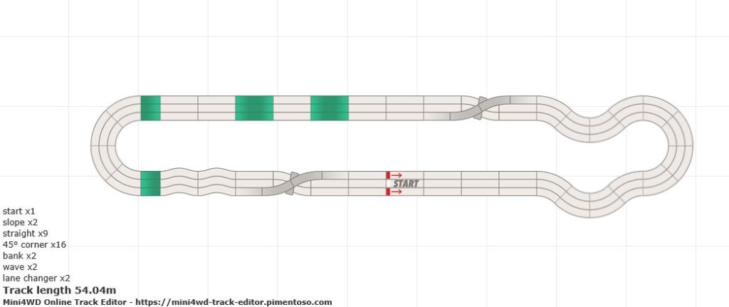 この冬季用コースは、レーンチェンジ2か所と、スロープ/テーブツトップ1か所、そして30度バンクから構成されています。なんとかストレートも多めにしてみました。店長の試走では19.56秒でしたが(充電池をフル充電すると18.24秒になりました)、これはノーマルモータなので、もっと記録は伸びていくでしょう。