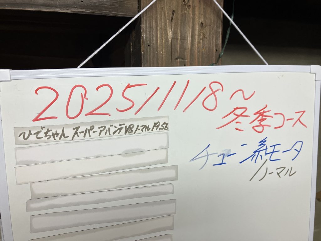 2025/11/9日、舞鶴電脳工作室2Fのミニ四駆試走コース(冬期間用)で、店長のスーパーアバンテ/VZシャーシ/ノーマルモータでタイム更新!しました。(19.56秒→18.24秒)やっぱり、単三充電池の充電仕立ては速いです。 チューン系/ノーマルモータでタイムアタックを記録して表彰したいと思っていますので、ぜひトライしてみてください。レーンチェンジ2か所とスロープ/テーブルトップ、30度バンクがありますので、あまり速いモータだとコースアウトしてしまうかもしれませんが、そこはチューンングしだいですね